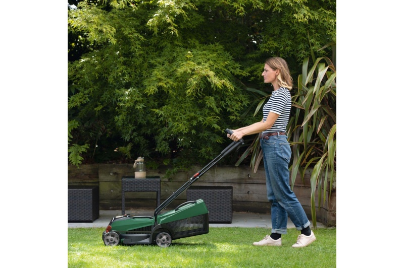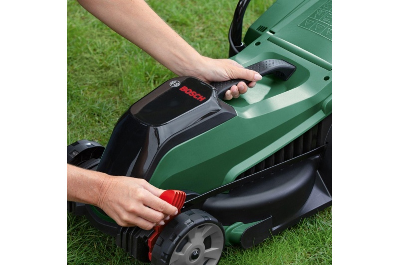 Bosch CityMower 18V offers cordless flexibility and is recommended for smaller urban lawns. The tool is lightweight, easy to manoeuvre and ideal for lawn sizes of up to 300 m2 (up to 200 m2 can be cut with one full 18V 4.0 Ah battery). Use the simple height of cut lever to select one of three grass length settings, between 30 mm and 60 mm. The lawnmower is able to mow closer to edges, walls and fences thanks to the integrated grass combs.
