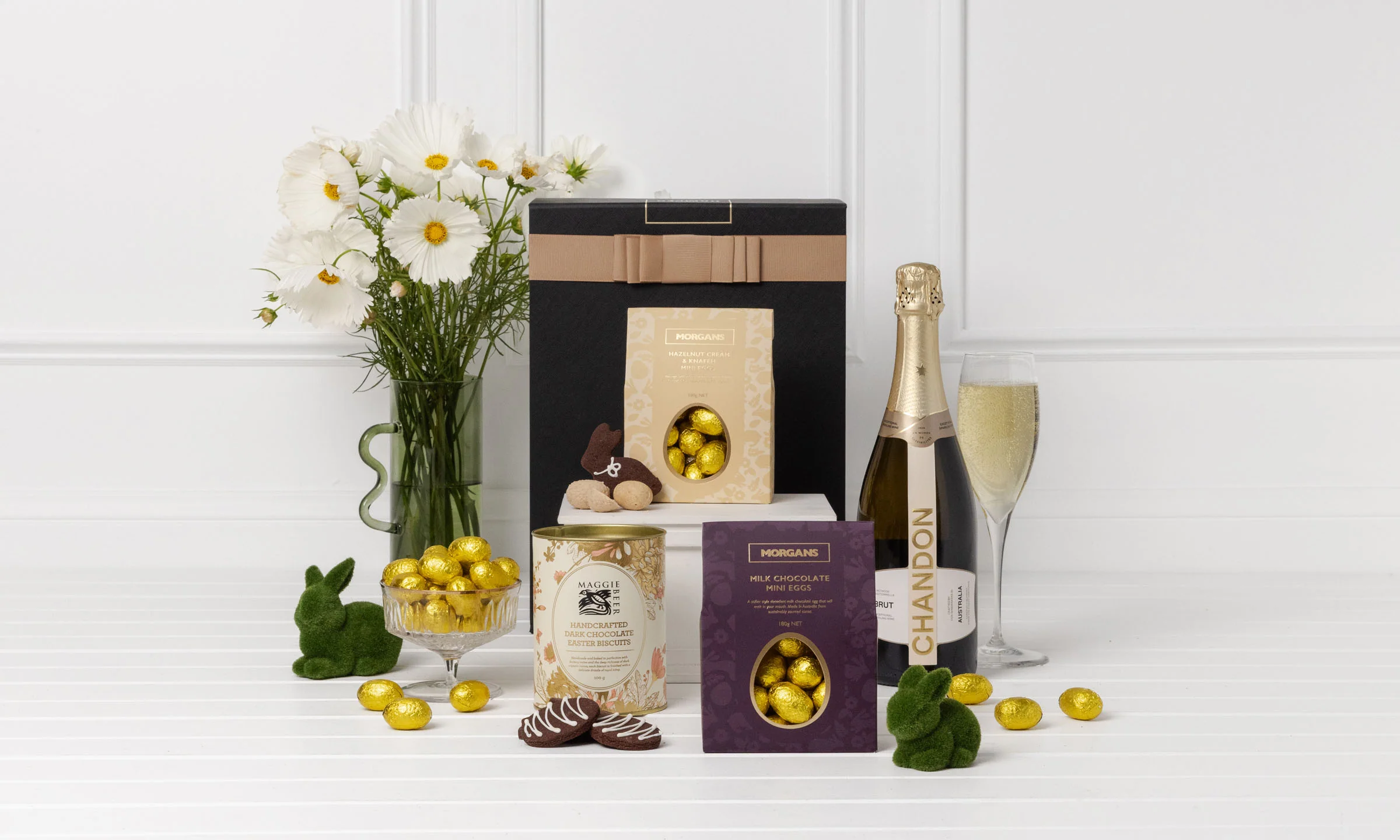 When Easter arrives, it brings with it delicious chocolate eggs, family fun, and precious memories. Then add sparkling wine, the ultimate friend to chocolate! This Easter hamper is a decadent treat with something sweet for everyone. The chocolate bunny and egg biscuits have a buttery base, dark chocolate, and royal icing. The milk chocolate eggs are perfectly creamy, and the white chocolate eggs feature knefe and hazelnut. Spoil with this sweet treat!