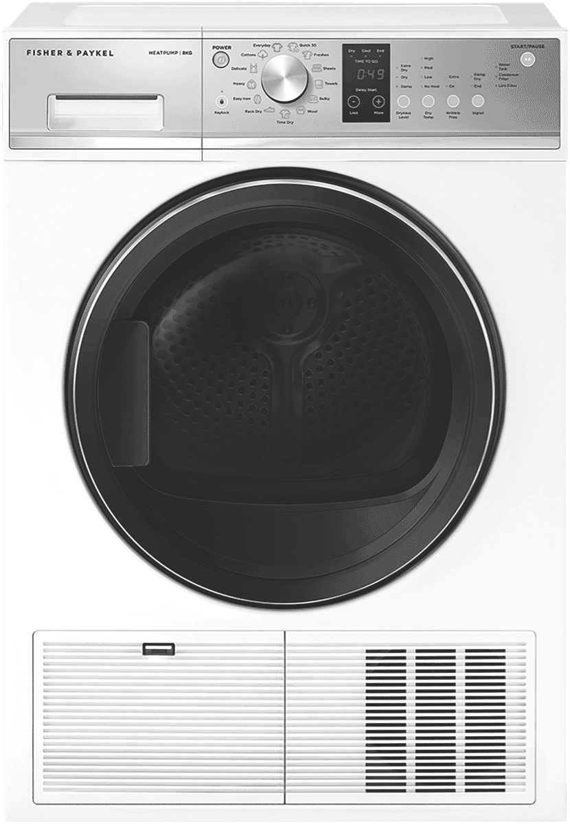 This white Fisher & Paykel heat pump dryer has the capacity to dry 8 kg (1kg the weight of one dry towel) or one queen doona, which is perfect for households of three or four. A heat pump dryer dries fabrics more carefully and efficiently than other types of dryers, which protects clothes and helps with power bill savings. Heat pump dryers don’t need to be vented outside so they’re perfect if you’re renting. You can go light on your electricity bills with its very high 7 star energy rating. Plus, the white Fisher & Paykel DH8060P3 has 13 types of drying programs, allowing you to get just the right setting for each load. It has bulky items, rack dry, towels, delicates, heavy-duty, and freshen up programs. The Fisher & Paykel heat pump dryer features a stainless steel drum. It’s 850mm high, 600mm wide, and 645mm deep, so carefully measure the space where you want your dryer to go and make sure there’s enough room for the door to open.