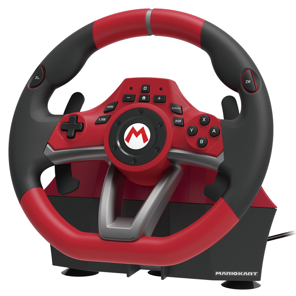 HORI is pleased to present the Nintendo Switch Mario Kart Racing Wheel Pro. This larger deluxe version of the racing wheel is ideal for the Mario Kart and racing gamer. The ergonomic wheel design, pedals, and convenient onboard controls were built to create an authentic racing simulation. Officially licensed by Nintendo.
