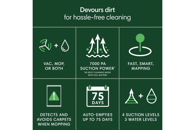 • Auto Empty Dock – hands free cleaning for up to 75 days, down to 0.7 microns