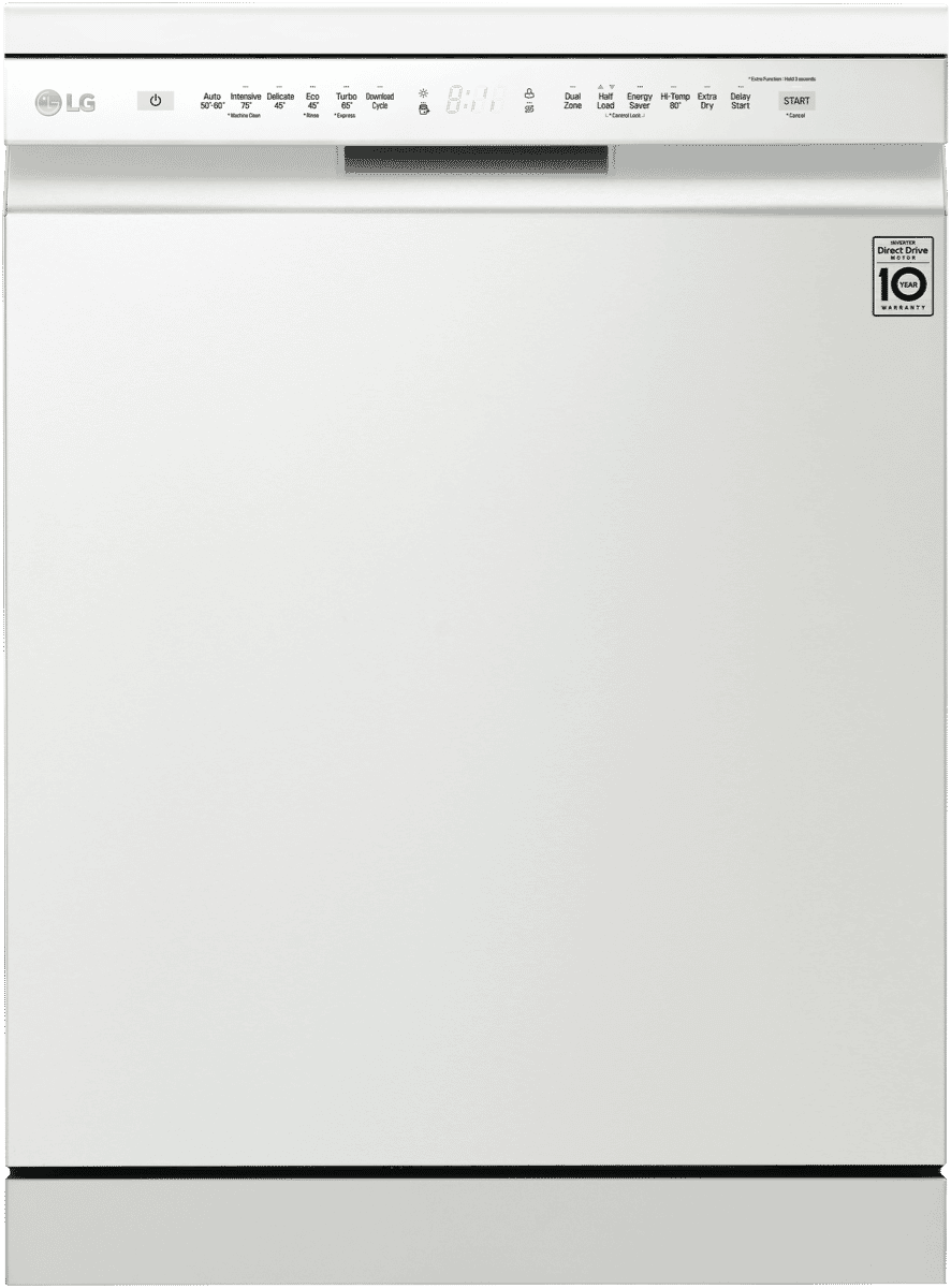 Wash up quick with the LG QuadWash White Dishwasher XD5B14WH. A minimalist exterior couples with a subtle micro LED display to create a statement most dishwashers can’t match. Clean from multiple angles thanks to QuadWash’s four rotating blades including two oscillating nozzles that pulse and deliver water thoroughly. Select Turbo Cycle to wash light or moderately dirty dishes in 59 minutes(1). LG’s own Direct Drive Motor is made with less moving parts for reliable and quiet cleaning, and is also backed by a 10 Year Warranty(2). Choose Dual Zone Wash to lightly clean delicate dishes and heavily scrub dirty pots and pans during the same wash. Load the dishes your way with folding tines, an adjustable height upper rack, and the Glide Rail making drop off and pickup smooth no matter how heavy the load is. Disclaimers: (1) Reduced load size (maximum 10 place settings) required. Cycle is “Wash” only. (2) 2 years parts and labour, plus 8 years on motor (parts only).