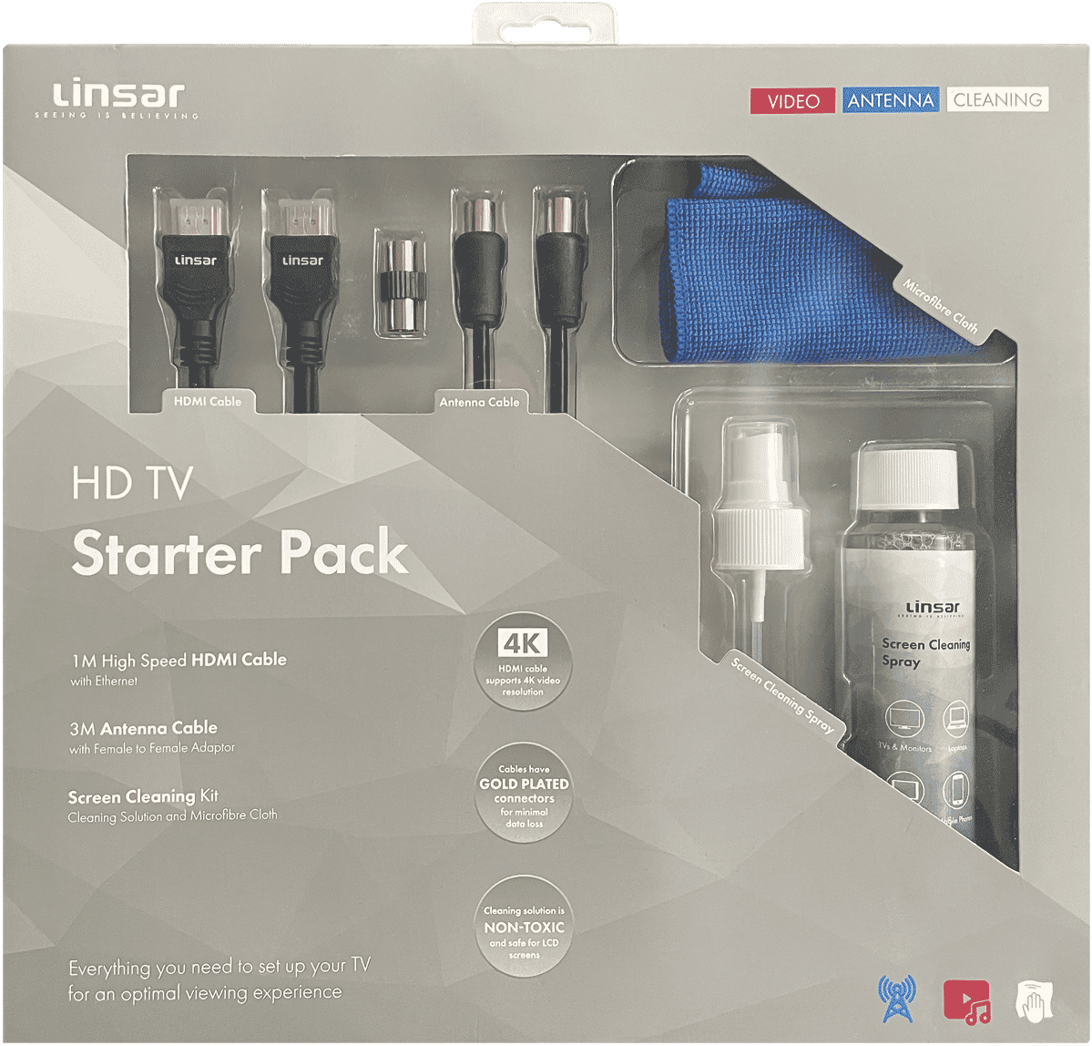 The ultimate TV starter and screen care solution kit, ready for you in one handy place 1M High Speed HDMI Cable 3M Antenna Cable with adaptor 120ml Screen clean solution with microfibre cloth