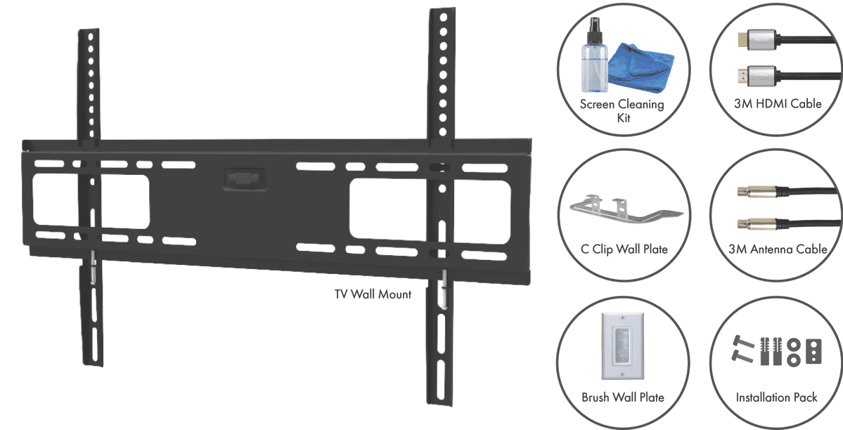 * Supports up to 89″” TVs* Low profile slim VESA compatible mount* 3m Braided HDMI Cable* 3m Braided Antenna Cable* Screen cleaning kit