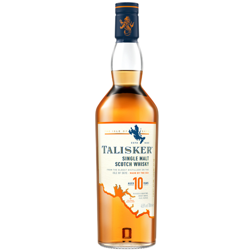 Talisker 10 Year Old is a famous Single Malt Scotch Whisky from the Isle of Skye, renowned for its coastal character and pronounced pepperiness. This whisky delivers a powerful, smoky profile with notes of sea salt, brine, dried fruit, and a distinct peppery finish, capturing the spirit of its rugged island home.