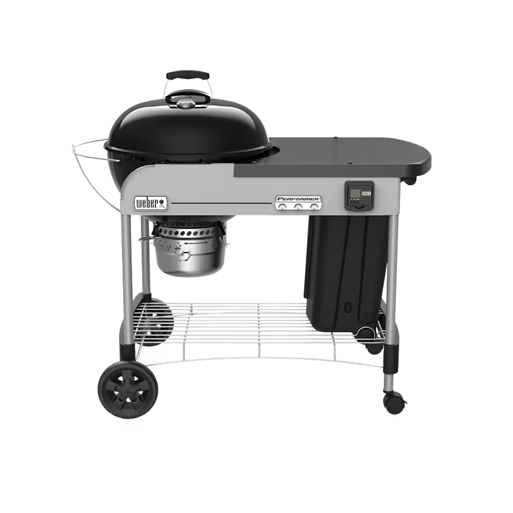 The ultimate Weber kettle is the Performer Premium. The convenient work surface is made of painted metal and underneath is a pull out storage bin for items such as additional charcoal or smoking woods. The Performer Premium also features a Tuck-Away lid holder that allows the lid to slide back and out of the way when accessing your food. And, with the removable digital cooking timer, you can take the guesswork out of timing those magnificent Weber roasts to perfection. The Performer Premium also features a stainless-steel Weber Gourmet Barbecue System cooking grill, P-vents, ash catcher ring with smoke setting indicator, and black lid handle and wheels.